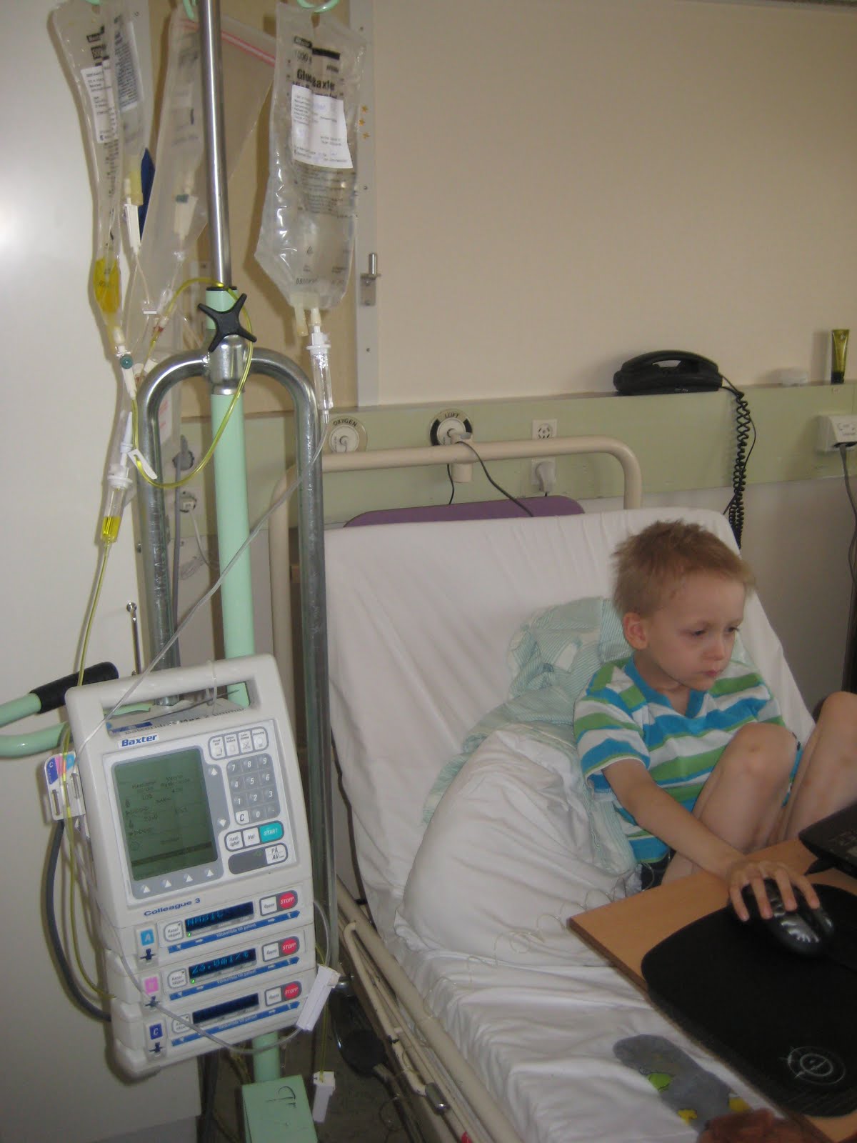 Nu när jag såg det, kom tankarna; där har vi varit och just ja, så där gjorde dom osv. Och så var Per (sjuksköterska) med, som jag tror var Antons favorit. (Roger och jag gillade också Per mycket.) Per hade verkligen tumme med Anton och är en sån person som verkligen är på rätt plats, han tog sig otroligt mycket tid (med alla barn tror jag). En sen kväll, när han jobbade natt, slog han sig ner i Antons säng och diskuterade gamla bilar, som var på datan och berättade om sin egen, en P1800. Roger och jag hade redan bäddat ner oss, när han dök upp och allt var så naturligt ändå och det var mycket Pers förtjänst då, för vad finns det för "naturligt" i att vara i en sjukhussal med sin 7-åriga son som får cancerbehandling egentligen...Nu är vi nöjda med personalen överhuvudtaget, men Anton har varit så ledsen, arg och förtvivlad under undersökningar/behandlingar, så det gör väl att vissa fastnar extra. Men personalen känns "handplockad" överlag. Man måste nog vara en ganska stark person för att kunna jobba med så svårt sjuka barn...